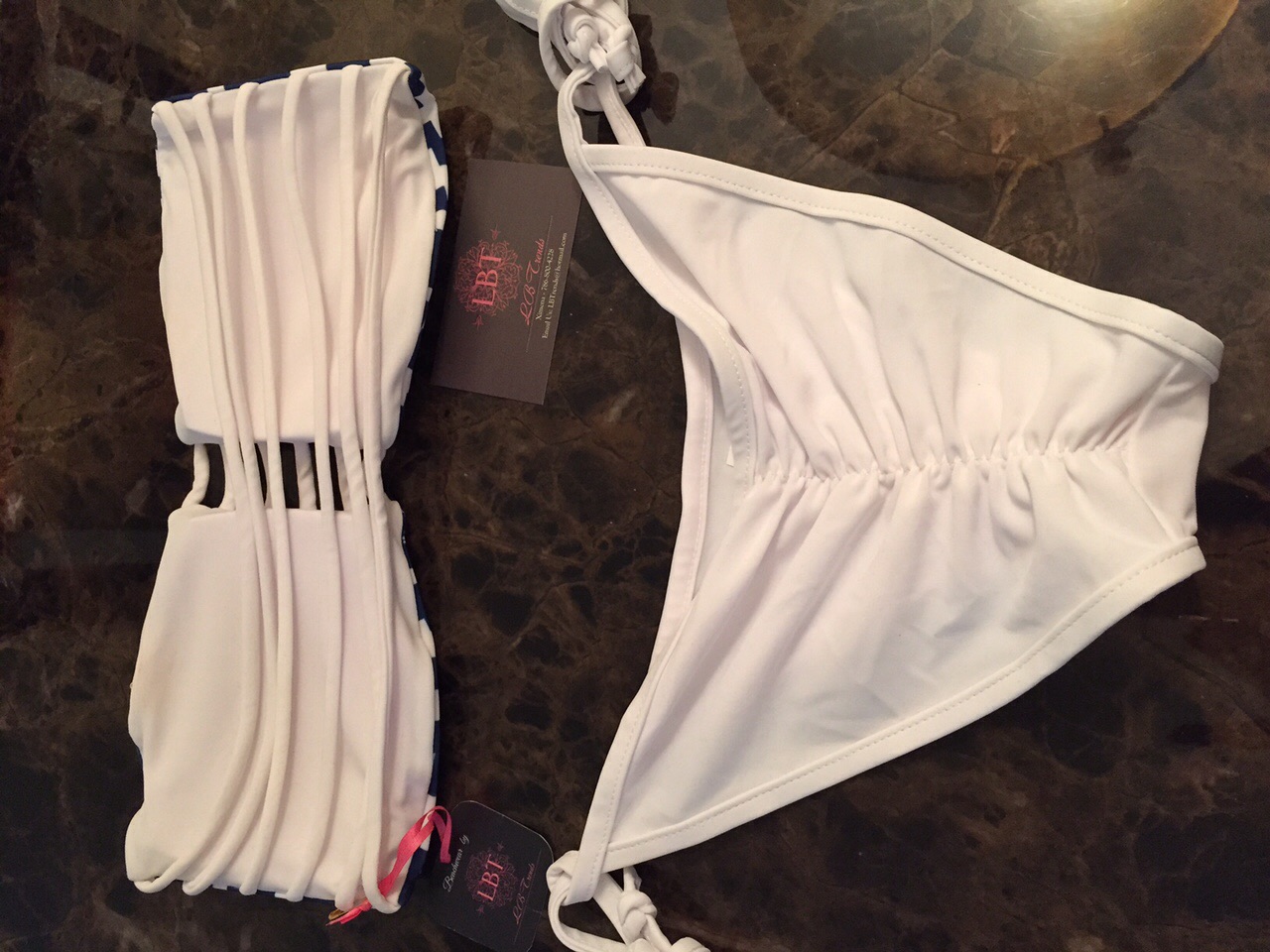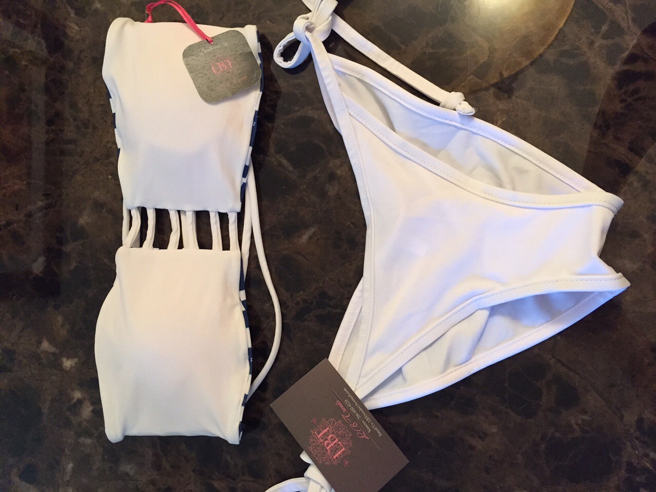 bandage padded reversible top straps that wrap around back, matched with a white scrunch bottom.