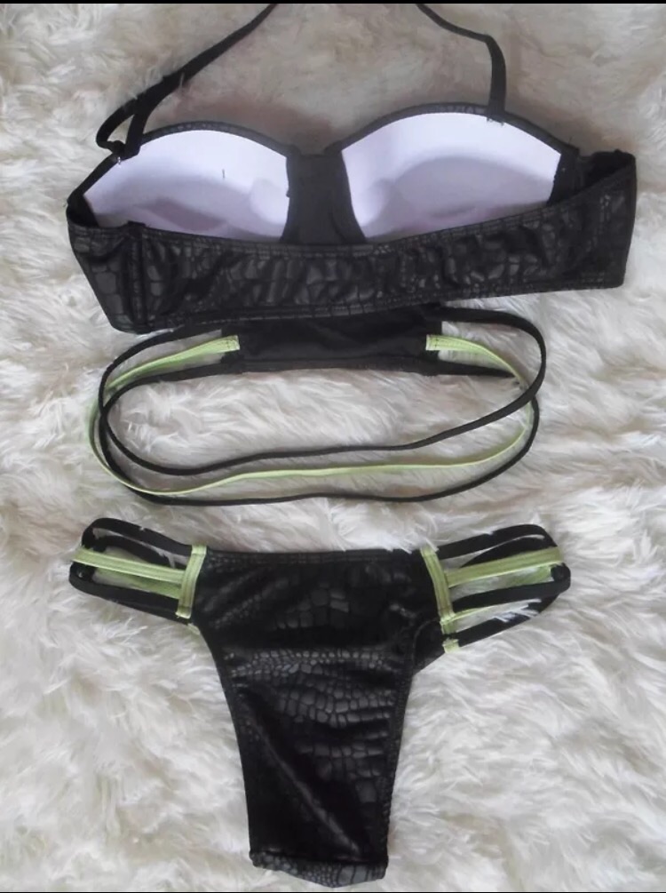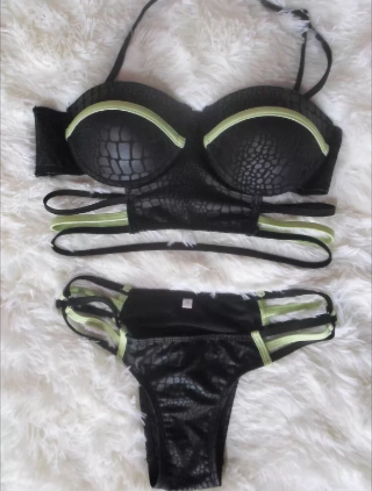 Gorgeous black crocodile skin pattern with a touch of lime green. Push up bra with removable straps, wraps around the back, paired with the matching Brazilian bottom.