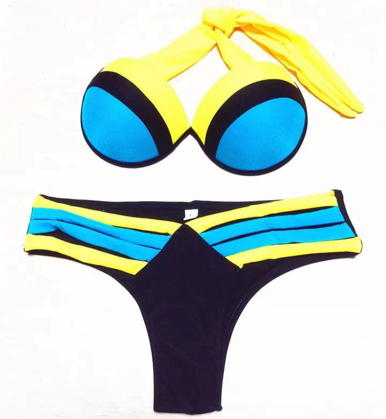 One hot piece! Padded top with removable straps, ties on back matched with low cut Brazilian bottom.