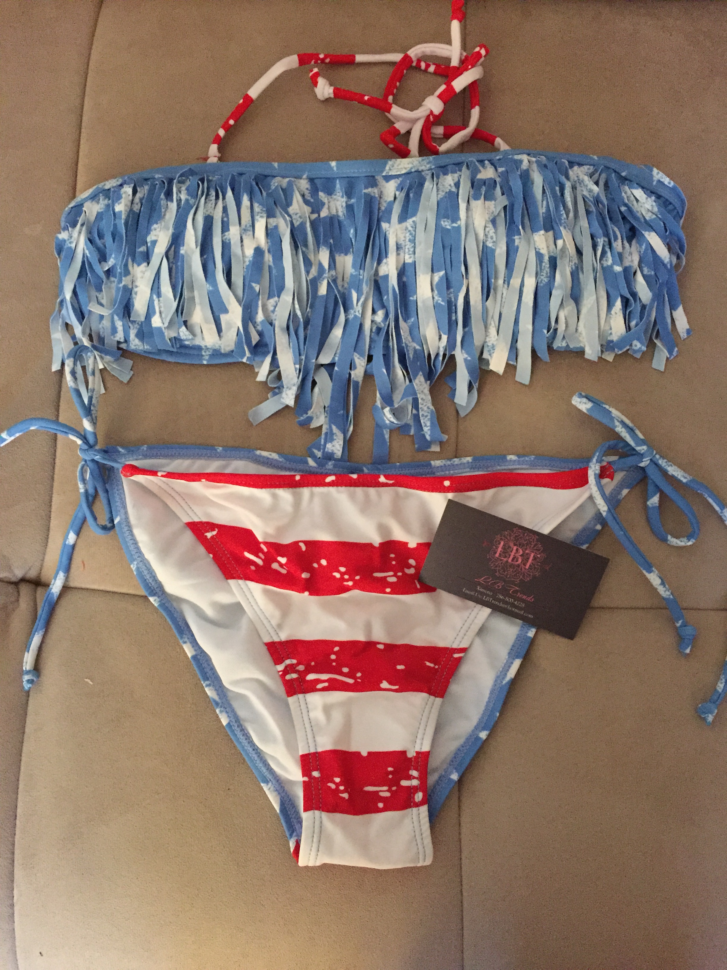 Celebrate America and show off this beautiful set at your next gathering,party or 4th of July. Set includes bandage top with adjustable strap at neck with front tassels and scrunch butt bottom that ties on sides